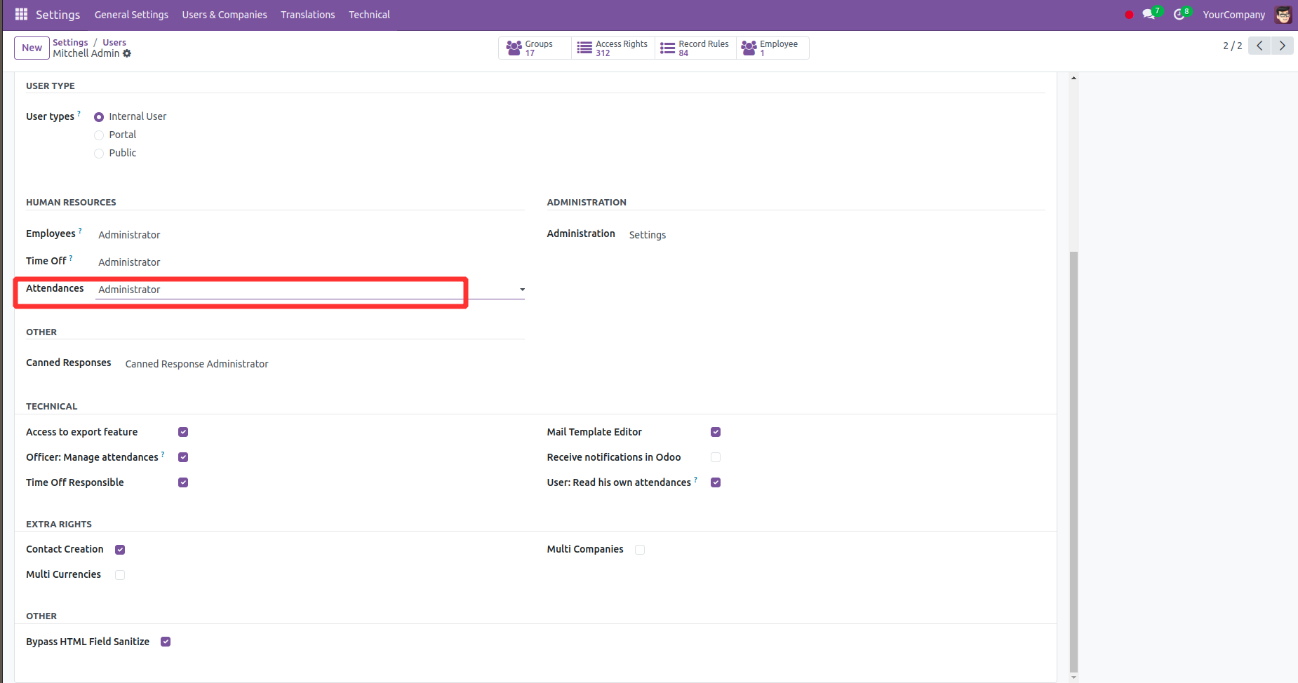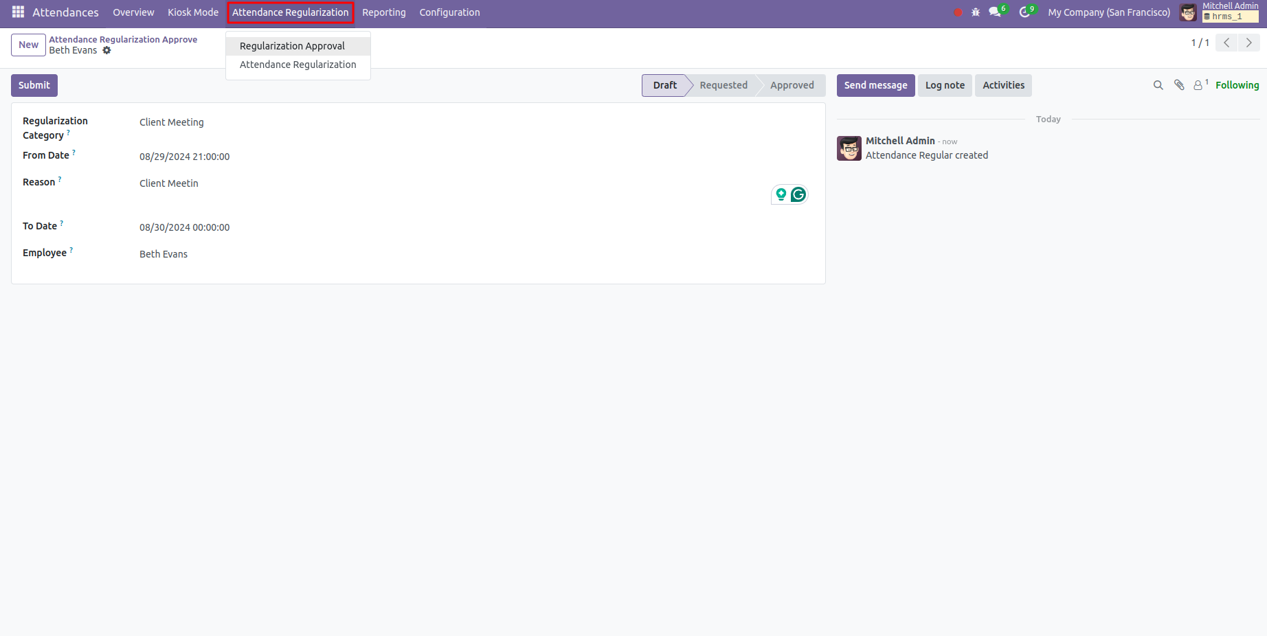 Attendance regularization requests can be reviewed and approved by managers or administrators, based on permissions set in the security configuration of the module.