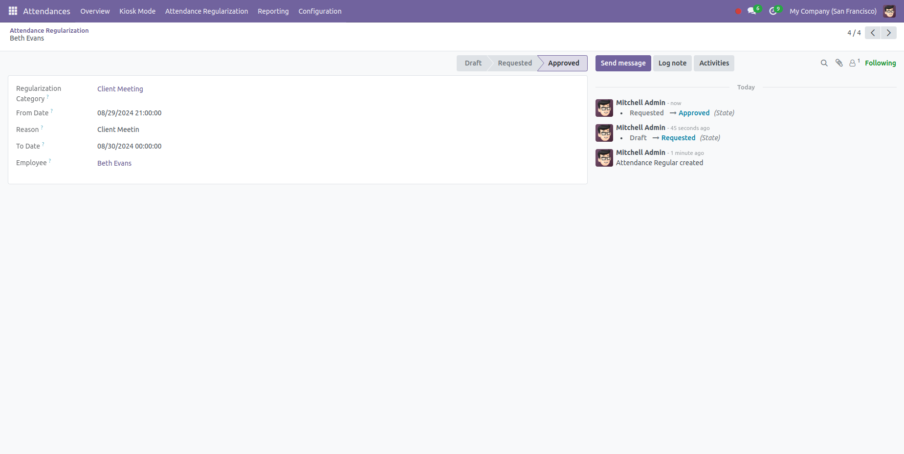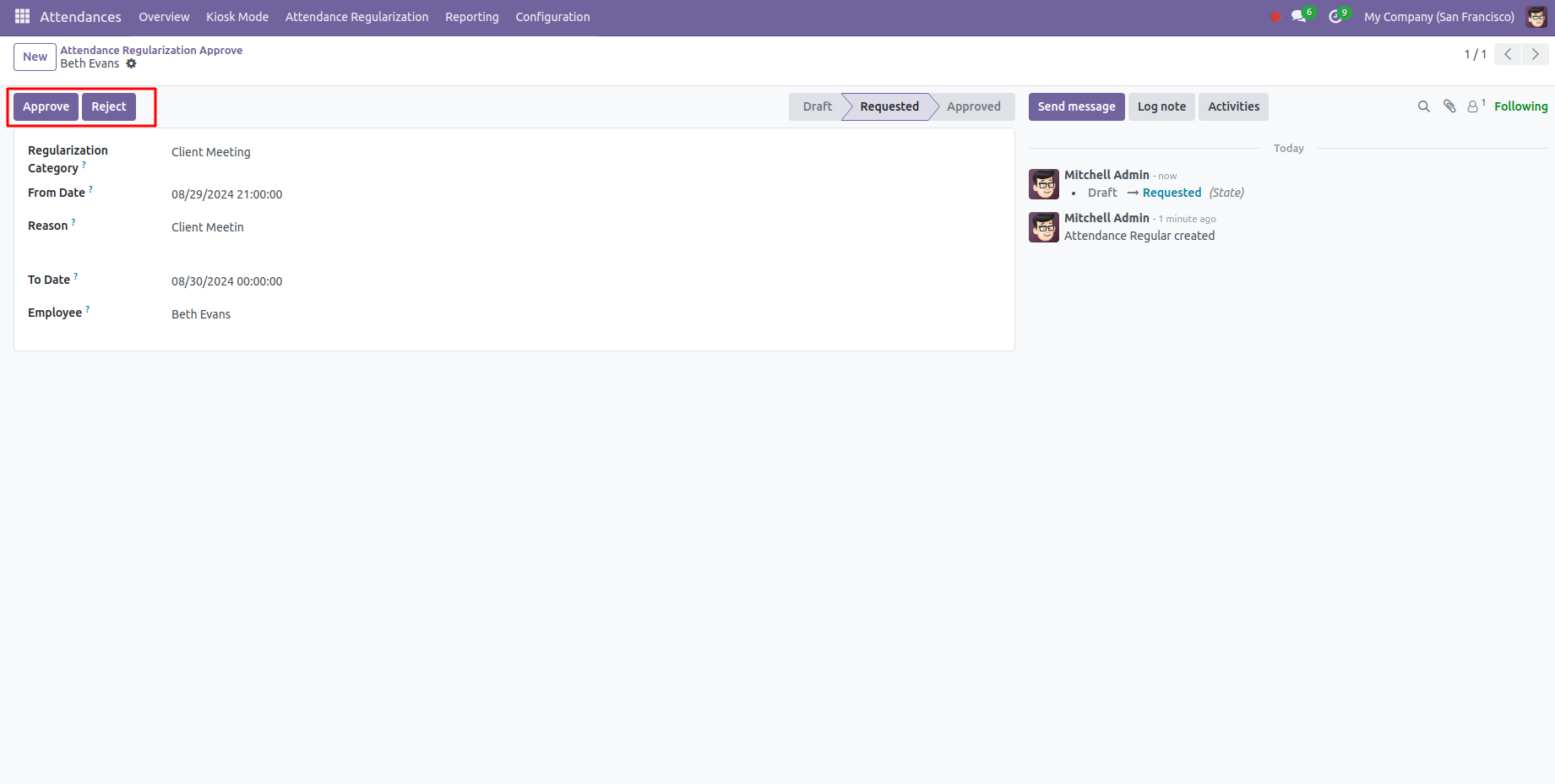 Now the Attendance Request is generated the manager can either 'Approve' or 'Reject' the request