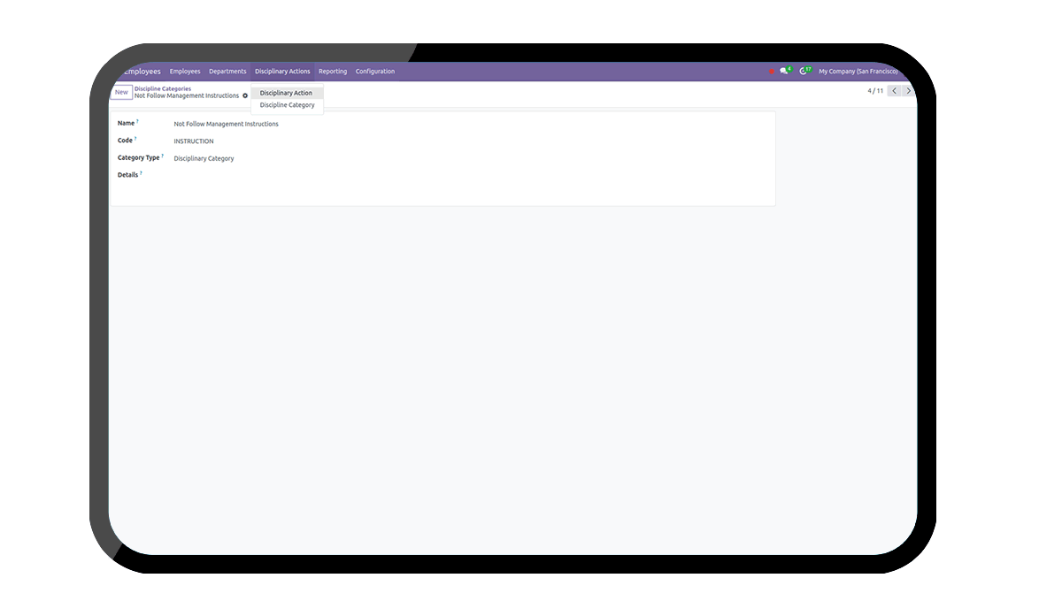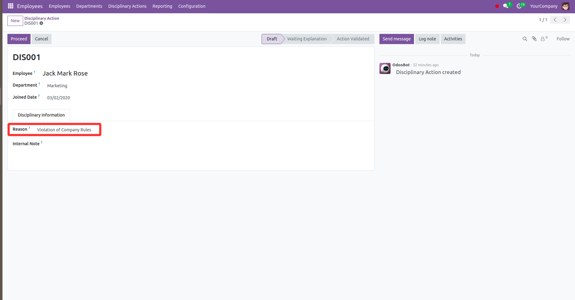 Create Disciplinary Actions from Employee Module and mention the reason for it and submit to proceed