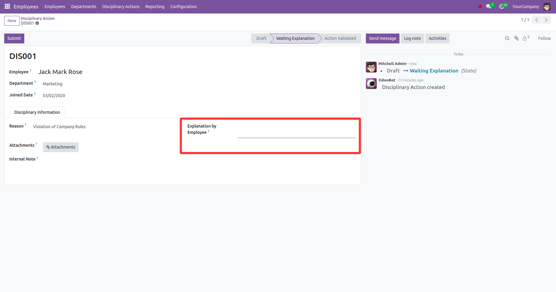 Employees can submit their explanation during the "Waiting Explanation" stage and send it to the manager.