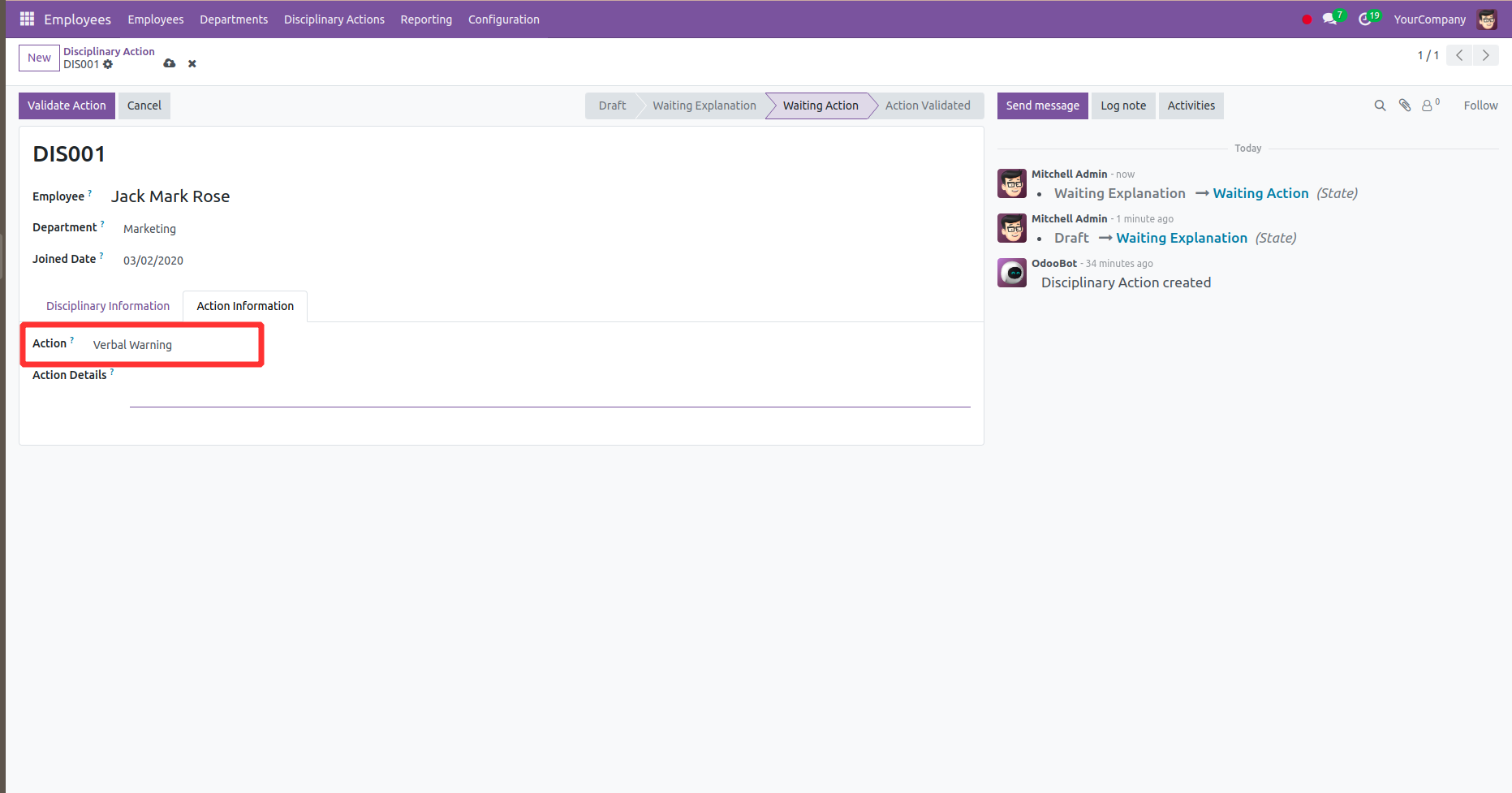 Yes, the module allows tracking of the status of each disciplinary action, such as "Draft," "Waiting for Explanation," "Submitted," and "Action Validated." This helps in maintaining an organized workflow.