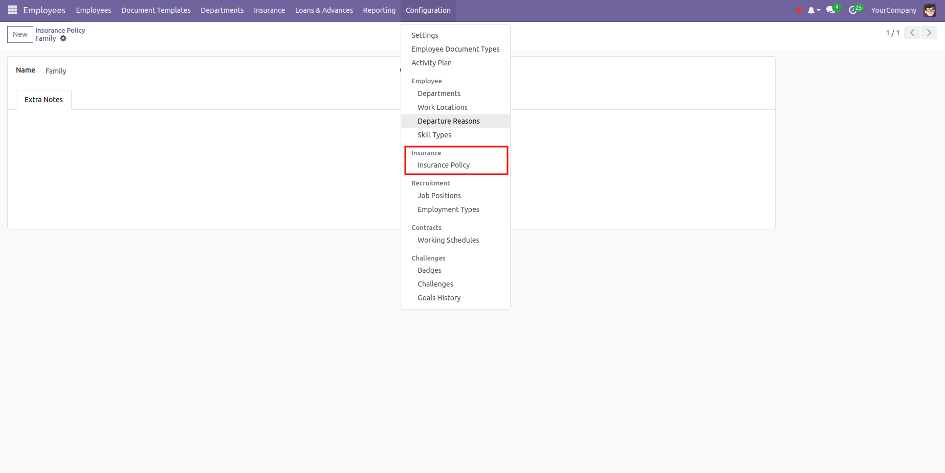Go to the Employee module, click on Configuration, and then select Insurance Policy to manage and configure employee insurance policies.