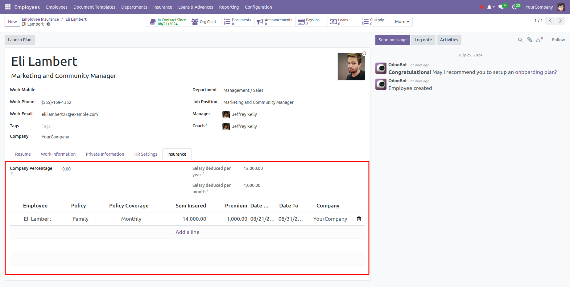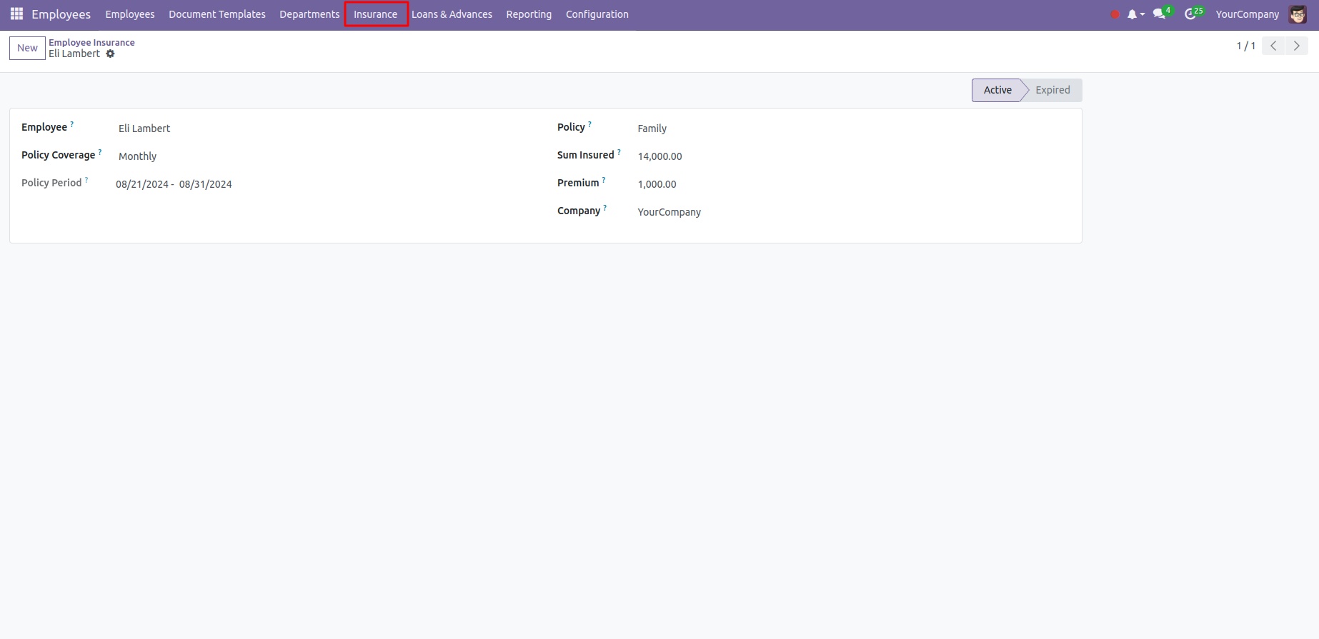 Yes, employee insurance details are visible directly from the employee form view. You can access, manage, and review insurance information for each employee from the Employee module.