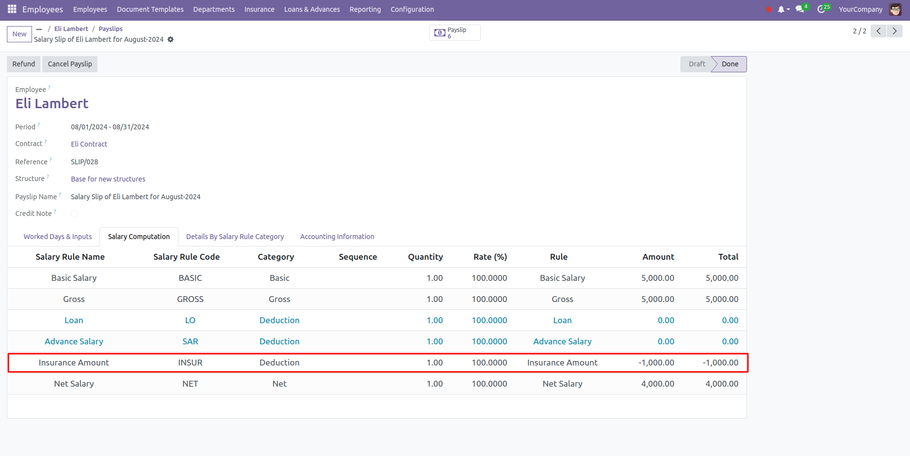 The insurance amount is deducted from the employee’s gross salary based on the policy assigned. The deduction appears in the payroll section under Deductions, and it is reflected on the payslip with the appropriate amount.