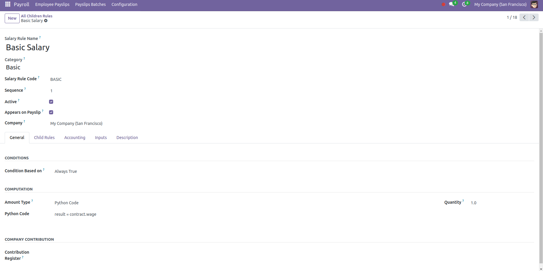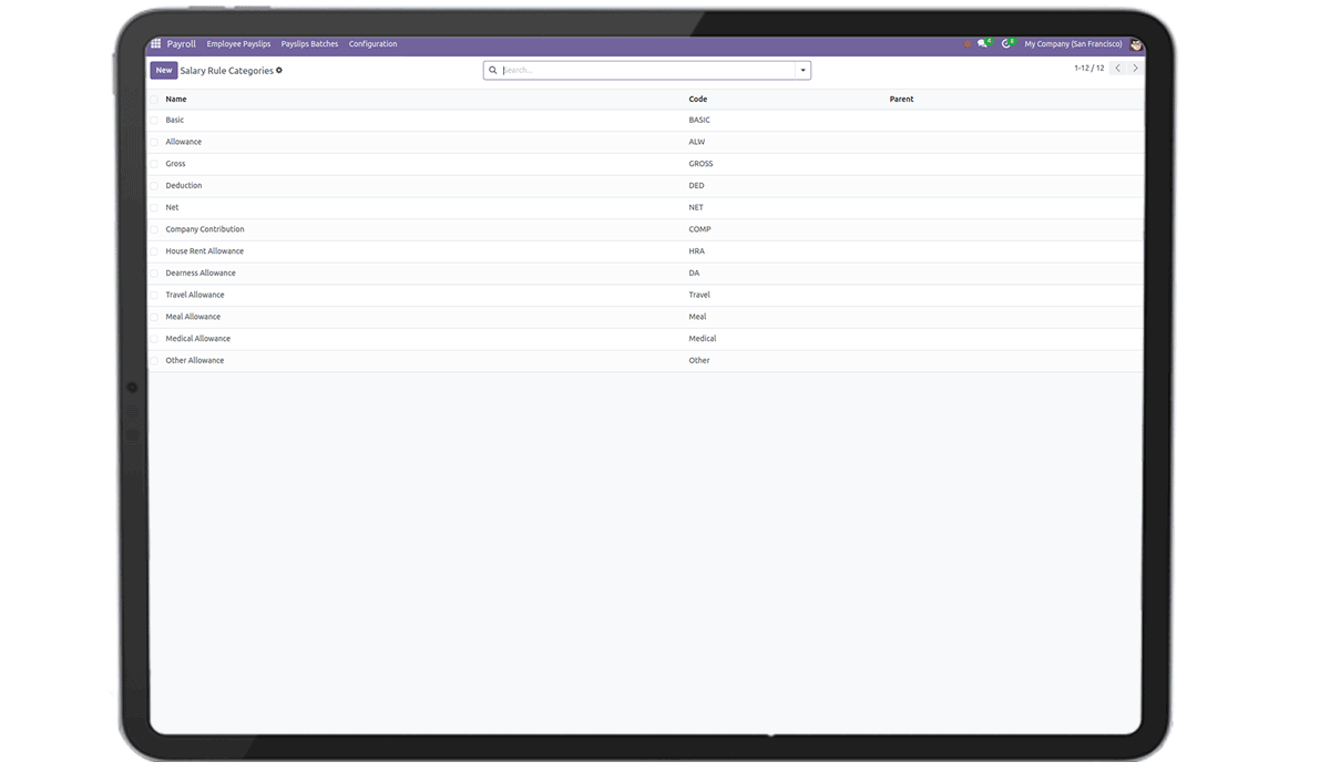 Navigate to Salary Rule Categories under Configuration in Payroll. Here, you can view the pre-defined Salary Rule Categories.