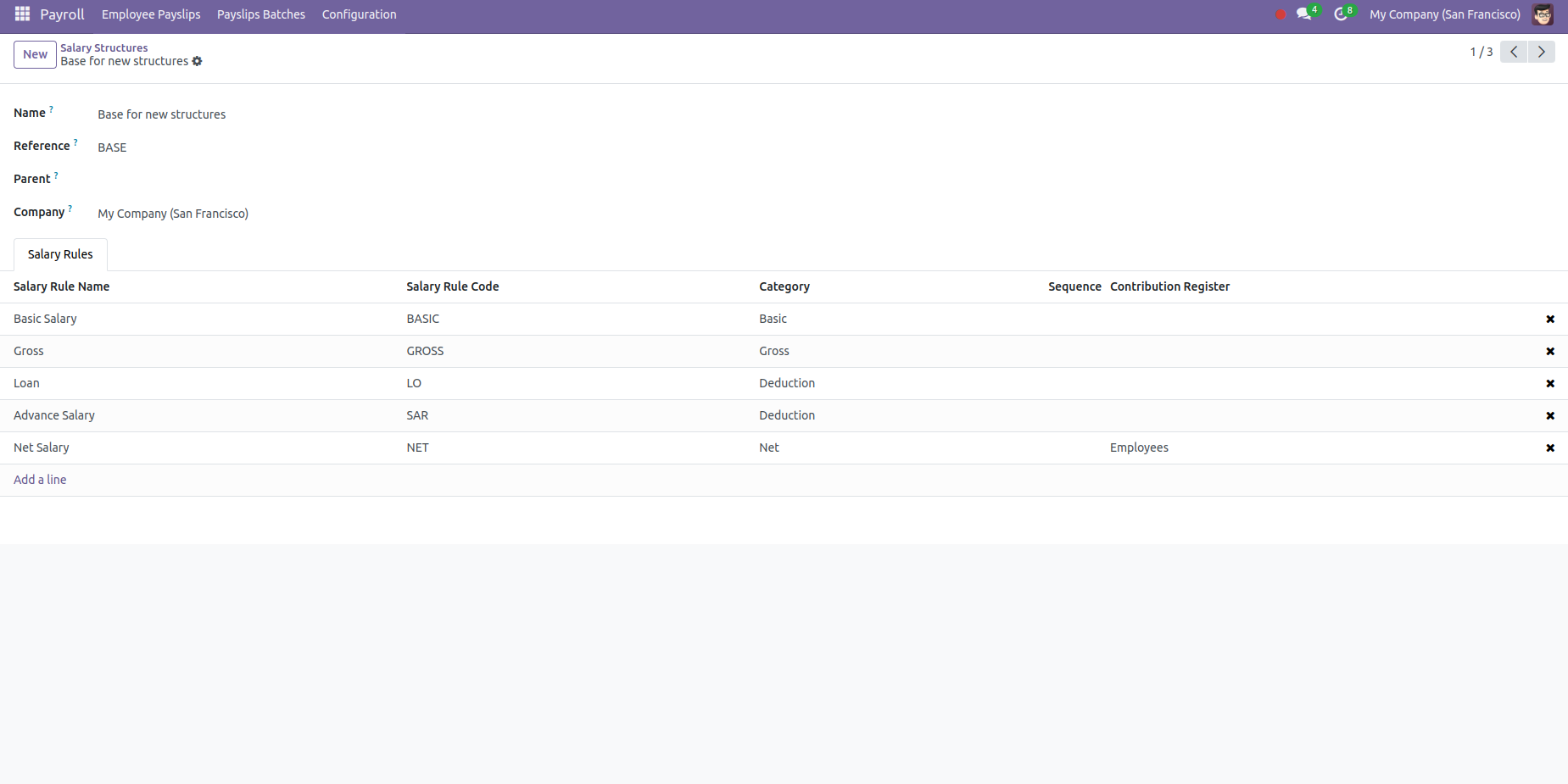 Navigate to Salary Structures under Configuration in Payroll and create new Salary Structure.