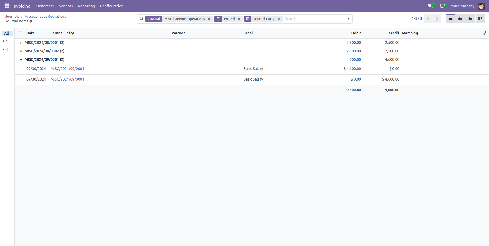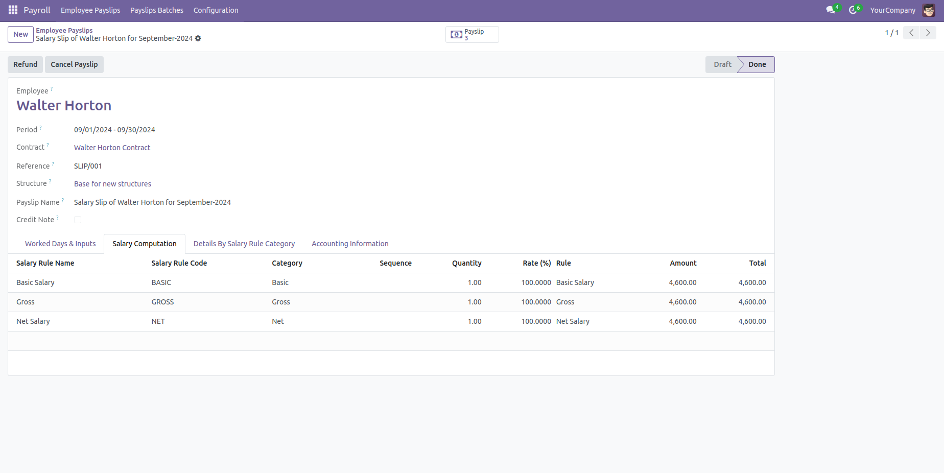 When a payslip is confirmed, the module generates journal entries in the ledger for each salary component.