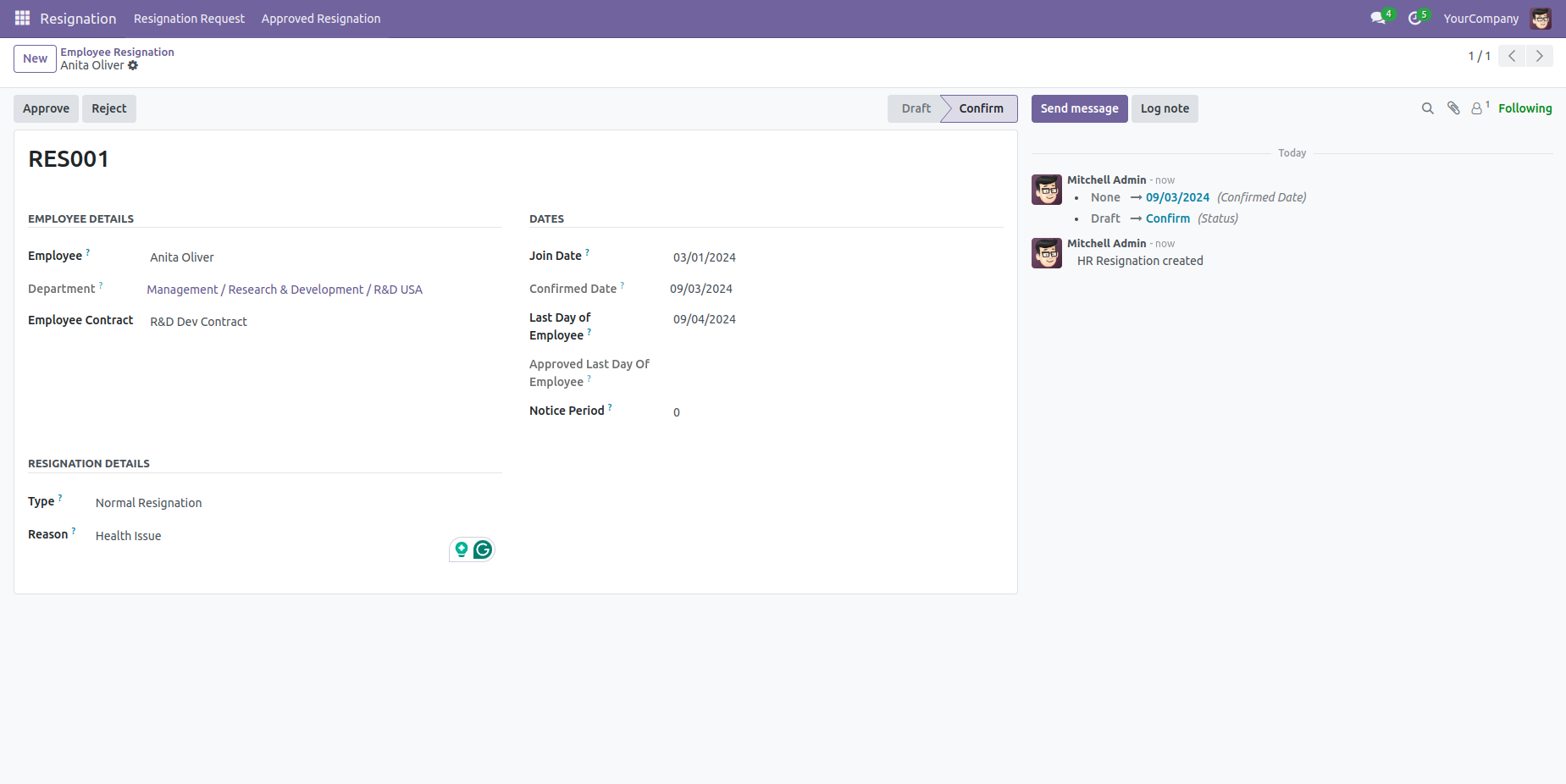 The Managers can Approve or Reject the Resignation Requests created by the Employees.