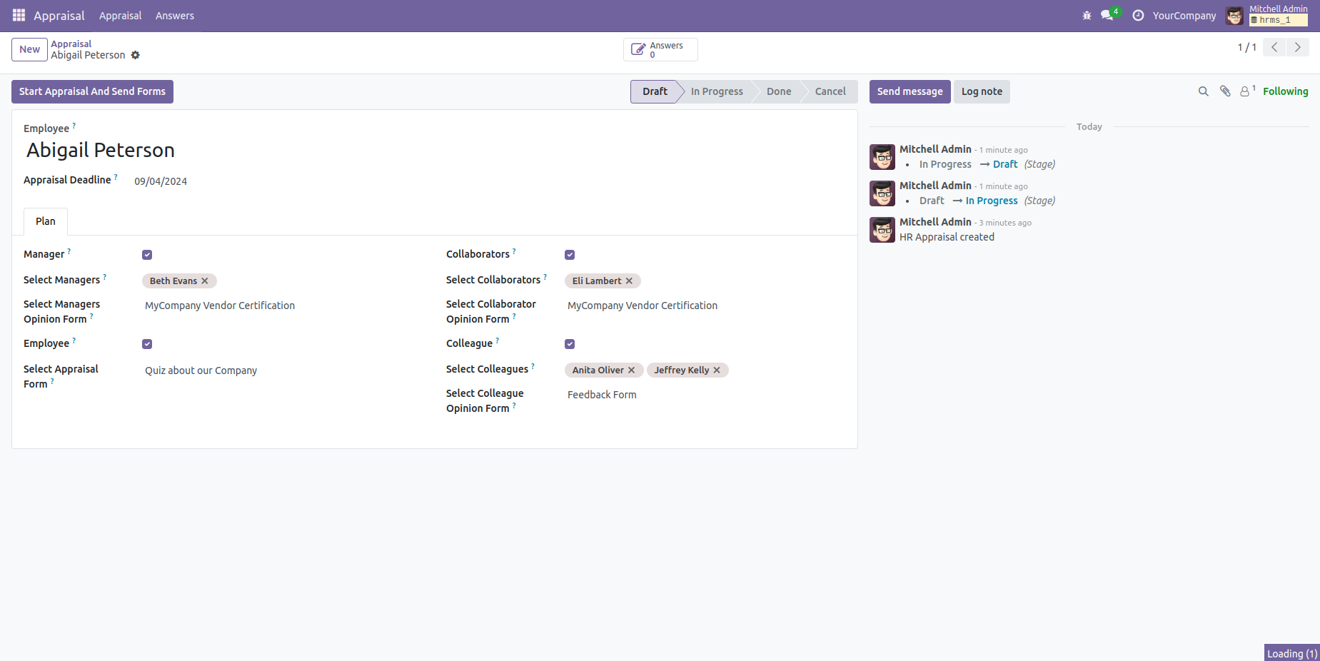 Appraisals can be assigned to employees through the employee profile, where you can set appraisal plans and define review stages.