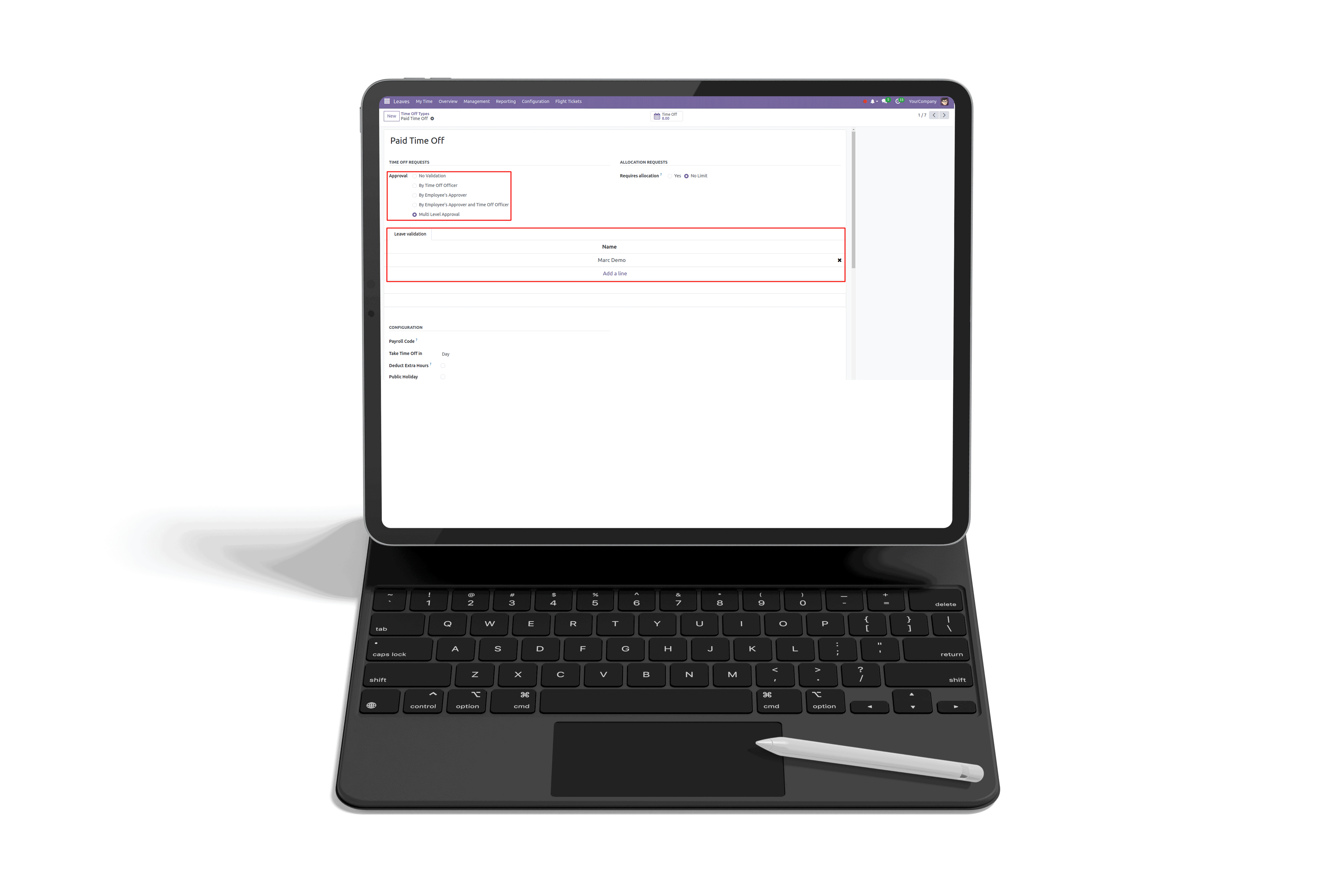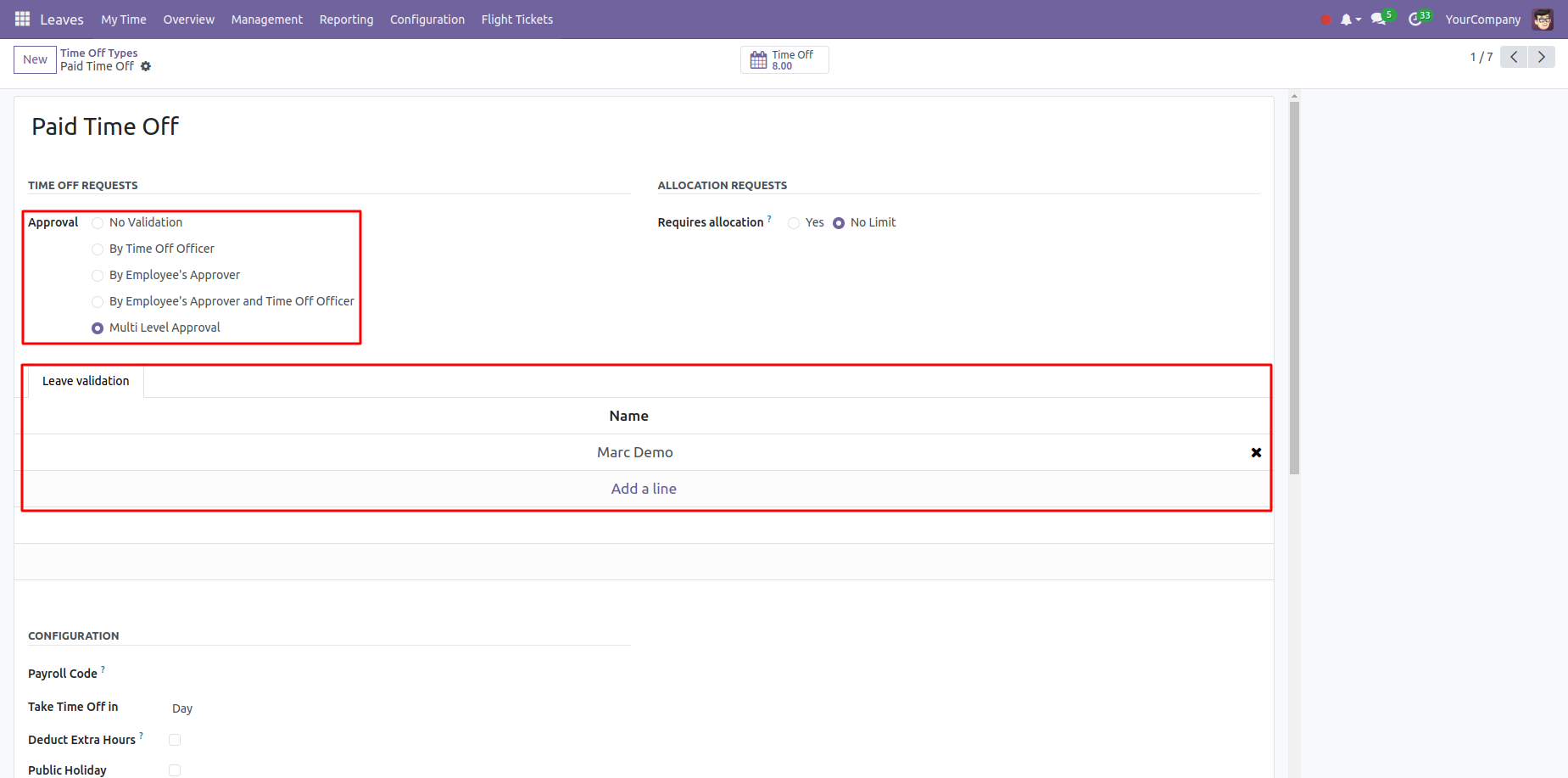Navigate to any Time Off Type and choose the Approval as Multi Level Approval and add the Leave Validators.
