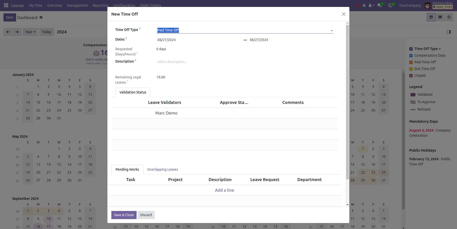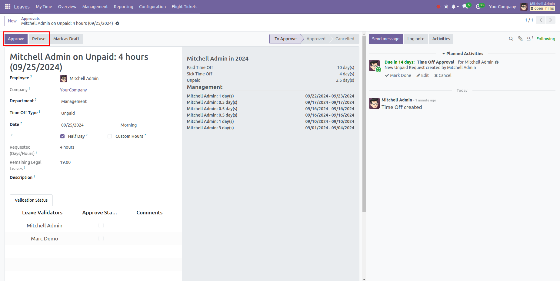 Create a New Time Off and choose the Time Off Type as that having the Approval as Multi Level Validation