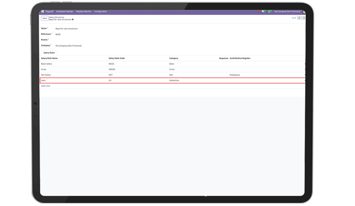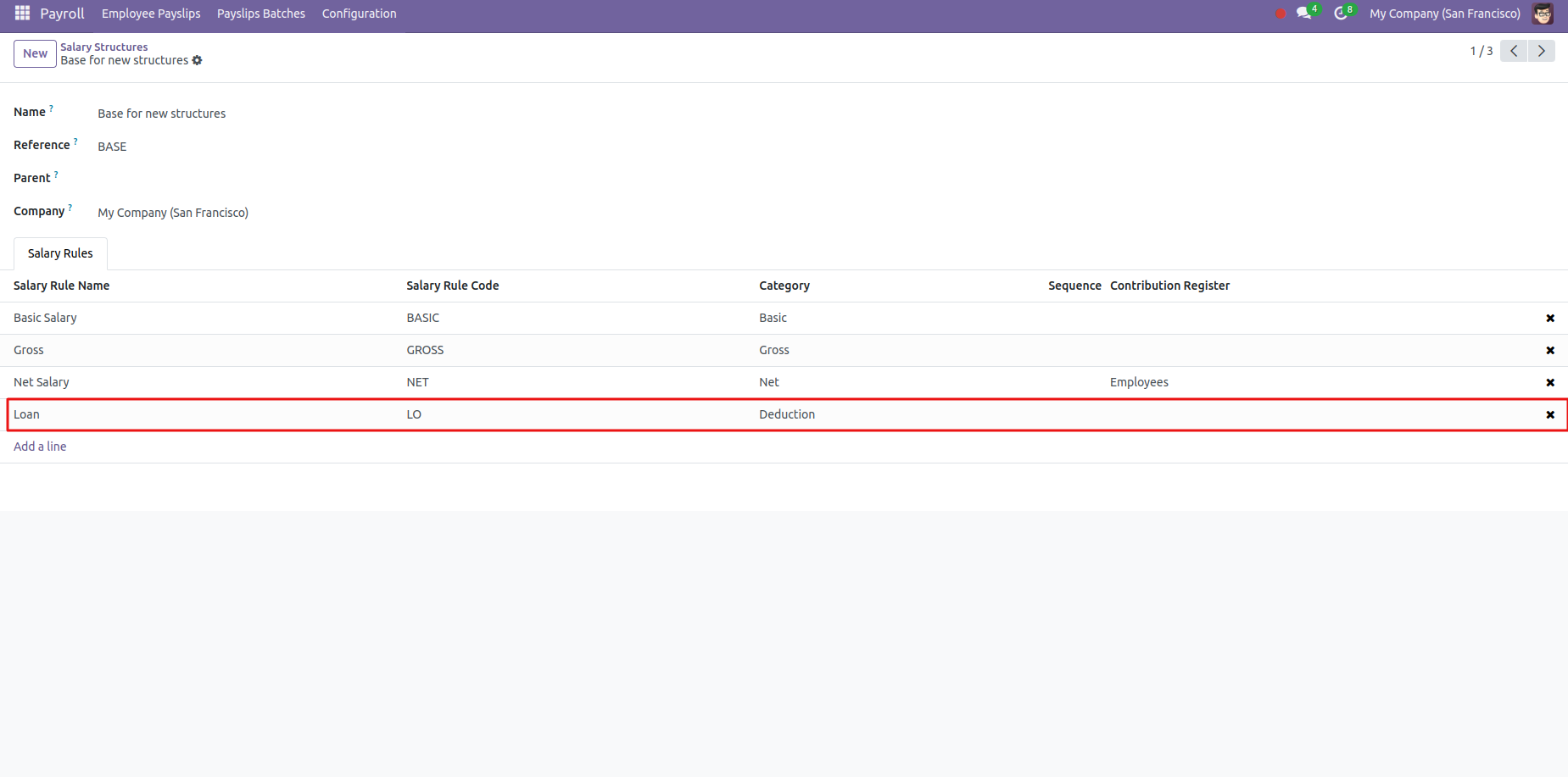 Create a salary deduction rule for loans by selecting 'Loan' as the Salary Rule Name.