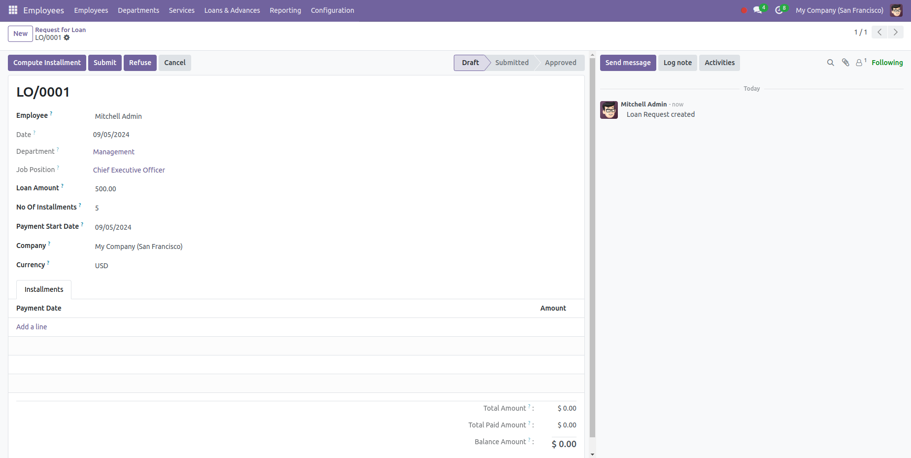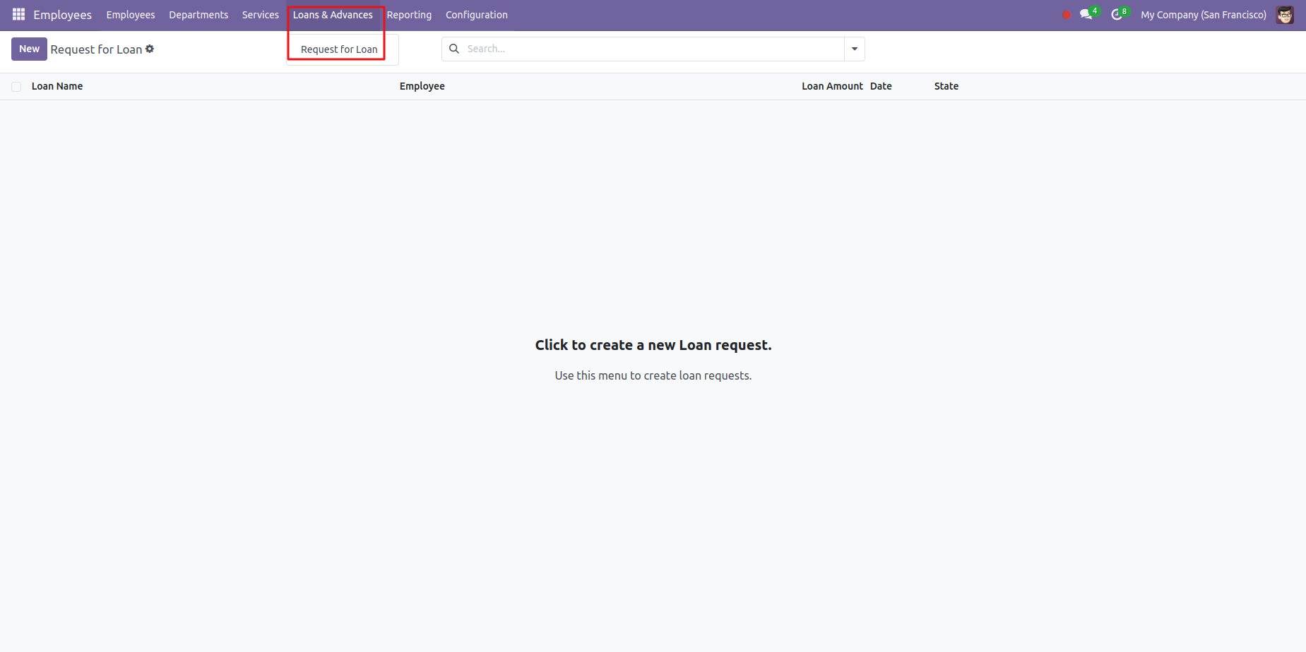 Navigate to Request for Loan under Loans & Advances in Employees module