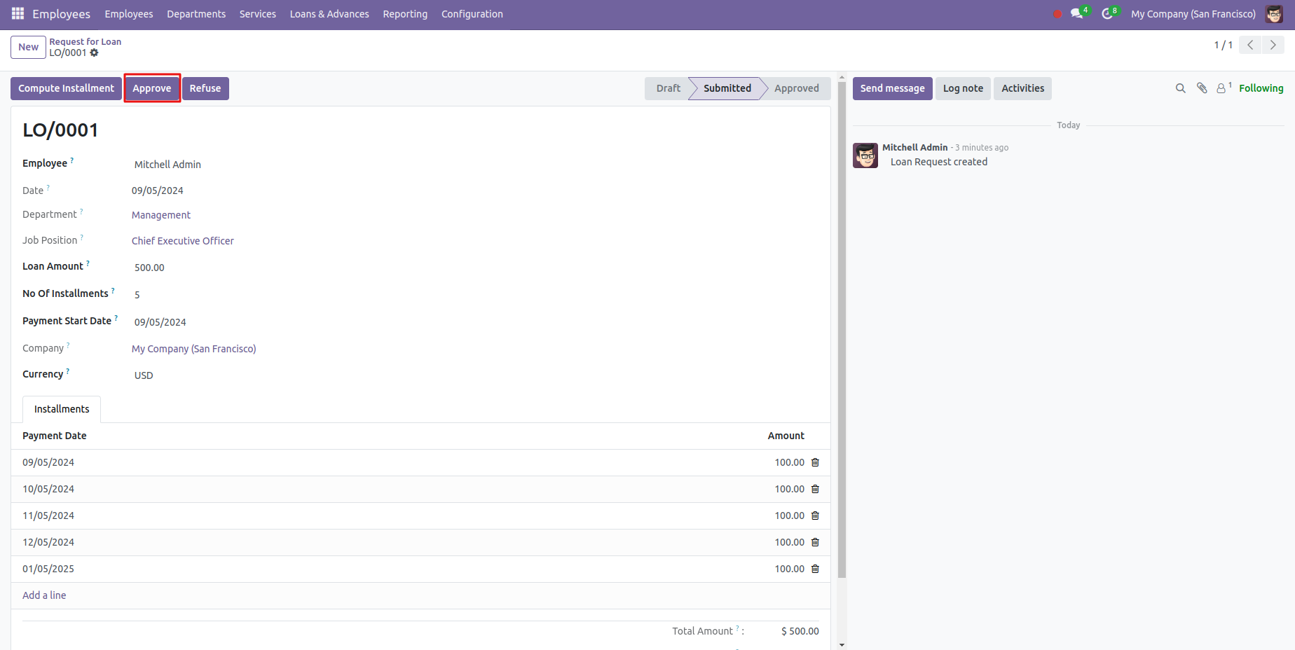After submitting the Loan Request, a user with Employee/ Administration rights can approve it by clicking the "Approve" button.