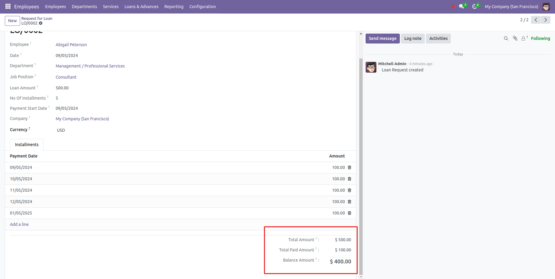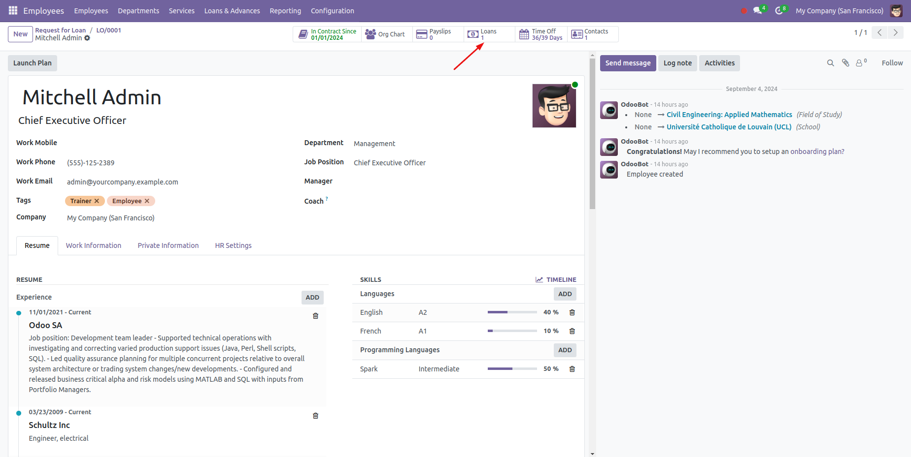 View Loan Requests for a specific employee by clicking the "Loans" smart button in the Employee Form view.