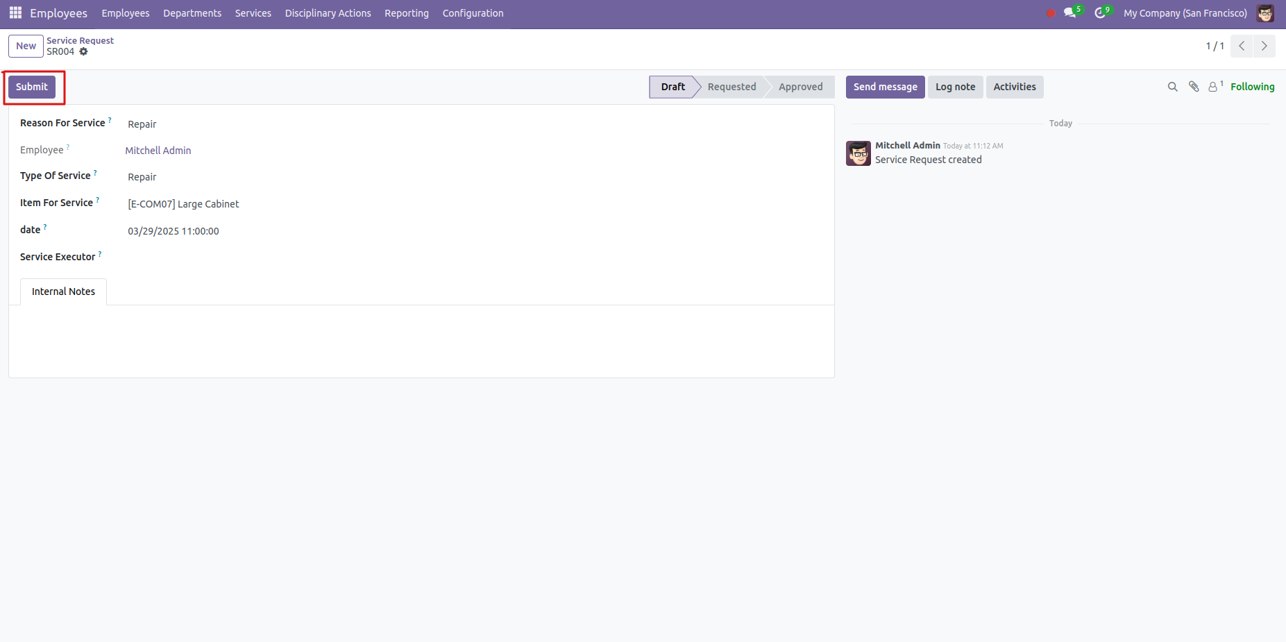 Employees can submit a service request by navigating to the Service Request section in the HR module and filling out the necessary details in the request form.