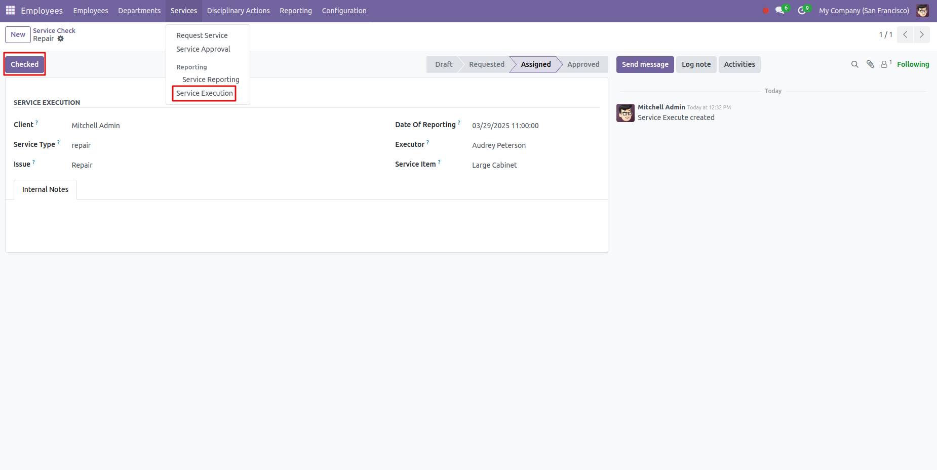 Go to Service Execution menu under Services menu. Click on the 'Checked' button after solving the request.